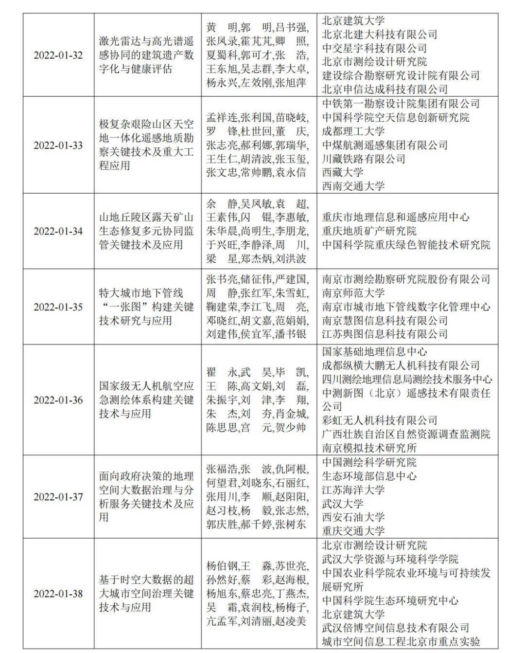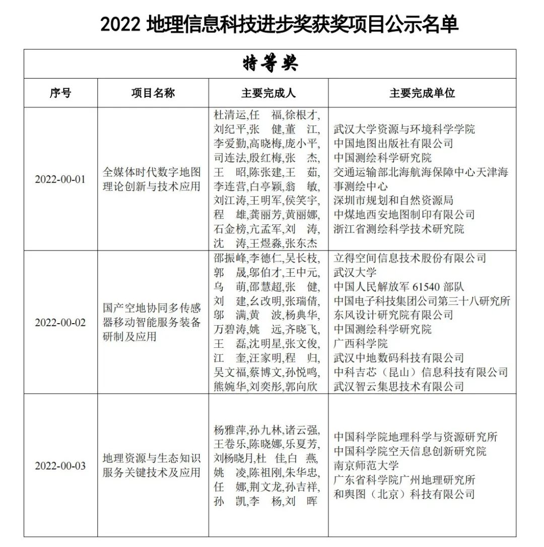 根據《地理信息科學技術獎勵辦法》《地理信息科技進步獎實施細則》,2022地理信息科技進步獎經申報、形式審查、網評、終評等程序,并經地理信息科學技術獎勵委員會審定,評出獲獎項目122項。其中,“全媒體時代數字地圖理論創新與技術應用”等6項成果為特等獎,由北京大學、中科星圖股份有限公司、北京北斗伏羲科技有限公司、北斗伏羲中科數碼合肥有限公司、深圳市坪山區政務服務數據管理局作為主要完成單位的“地球時空框架剖分理論、技術及應用”成果評為一等獎。