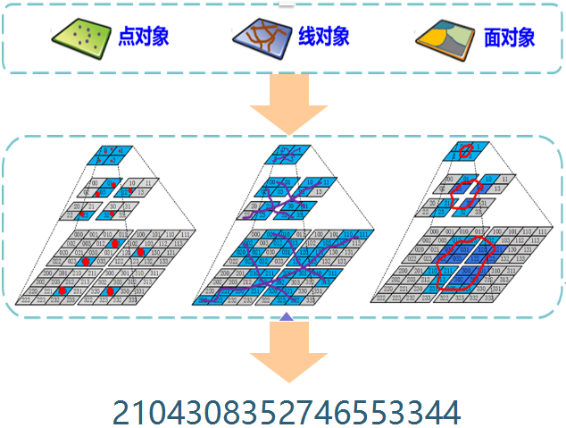 在對現有系統不推倒不重來及保護現有數據庫獨立性的基礎上,充分利用數據中的“空間位置”屬性,增加北斗網格編碼字段,作為ID對各種數據進行統一標識,并以其為紐帶構建對象內在的時空關聯關系,建立編碼動態索引,實現大數據統一組織與高效查詢。同時,利用網格編碼一維、整型、二進制的特點,實現時空大數據的計算、傳輸、分發、服務等應用的高效“編碼化操作”。
