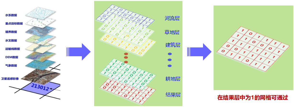 通過天基、空基和地基等多種遙感和測繪手段,獲取道路、地形、高程、坡度、植被、河流、草地、耕地、DEM(數據)、三維DTM(數字地面模型)、以及氣象水文等數據,形成目標區(qū)域的多圖層地理信息庫。在各圖層地理信息庫生成的同時,按GeoSOT規(guī)則將數據信息剖分成合適尺度的網格,并給每個網格賦予北斗網格編碼,對現有的地理信息庫同樣增加北斗網格編碼。根據多圖層數據,量化每一個空間網格對于規(guī)劃對象的可通過性,可將通過的網格標為1,不可通過的網格標為0,利用北斗網格碼的高效計算特性,快速得出該對象在目標區(qū)域可以通過的網格,進而規(guī)劃出合理的路線。